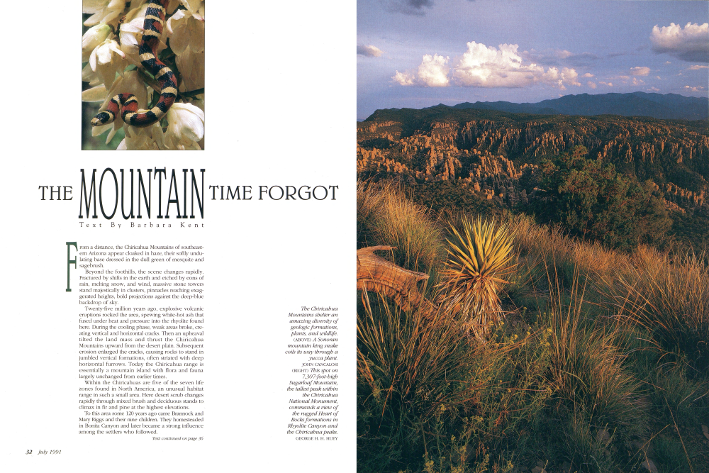 From a distance, the Chiricahua Mountains of southeastern Arizona appear cloaked in haze, their softly undulating base dressed in the dull green of mesquite and sagebrush.
