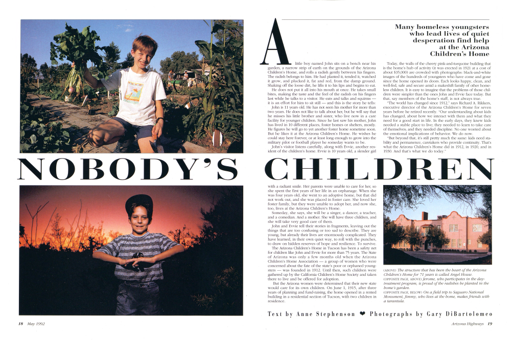 A little boy named John sits on a bench near his garden, a narrow strip of earth on the grounds of the Arizona Children's Home, and rolls a radish gently between his fingers. The radish belongs to him. He had planted it, tended it, watched it grow, and plucked it, fat and red, from the damp ground. Shaking off the loose dirt, he lifts it to his lips and begins to eat. He does not put it all into his mouth at once. He takes small bites, making the taste and the feel of the radish on his fingers last while he talks to a visitor. He eats and talks and squirms it is an effort for him to sit still and this is the story he tells: John is 11 years old. He has not seen his mother for more than two years. He does not like to talk about her, but he will say that he misses his little brother and sister, who live now in a care facility for younger children. Since he last saw his mother, John has lived in 10 different places, foster homes or shelters, mostly. He figures he will go to yet another foster home sometime soon. But he likes it at the Arizona Children's Home. He wishes he could stay here forever, or at least long enough to grow into the military pilot or football player he someday wants to be. John's visitor listens carefully, along with Evvie, another resident of the children's home. Evvie is 10 years old, a slender girlwith a radiant smile. Her parents were unable to care for her, so she spent the first years of her life in an orphanage. When she was four years old, she went to an adoptive home, but that did not work out, and she was placed in foster care. She loved her foster family, but they were unable to adopt her, and now she, too, lives at the Arizona Children's Home. Someday, she says, she will be a singer, a dancer, a teacher, and a comedian. And a mother. She will have three children, and she will take very good care of them. John and Evvie tell their stories in fragments, leaving out the things that are too confusing or too sad to describe. They are young, but already their lives are enormously complicated. They have learned, in their own quiet way, to roll with the punches, to draw on hidden reserves of hope and resilience. To survive. The Arizona Children's Home in Tucson has been a safety net for children like John and Evvie for more than 75 years. The State of Arizona was only a few months old when the Arizona Children's Home Association - a group of women who were concerned about the fate of the state's poor or orphaned youngsters was founded in 1912. Until then, such children were gathered up by the California Children's Home Society and taken there to live and be offered for adoption. But the Arizona women were determined that their new state would care for its own children. On June 1, 1915, after three years of planning and fund-raising, the home opened in a rented building in a residential section of Tucson, with two children in residence.