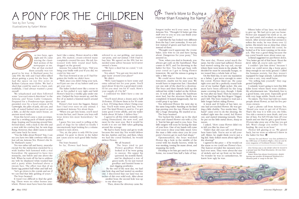 Our two boys, ages eight and 10, came waving the classified section of the newspaper at me. The ad that excited them actually was too good to be true. A Shetland pony for only $50. My wife and I had often talked about getting a pony for the boys. We had the space on our five acres in Kellner Canyon near Globe. We had a shed that could be used as a barn, and, truthfully, I had always wanted a pony myself.
