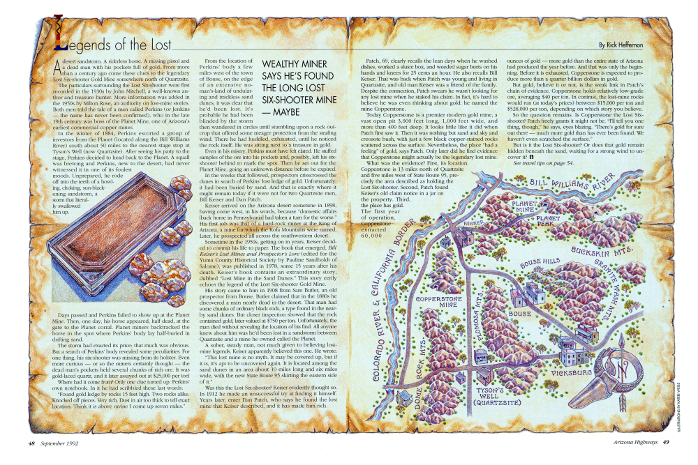 A desert sandstorm. A riderless horse. A missing pistol and a dead man with his pockets full of gold. From more than a century ago come these clues to the legendary Lost Six-shooter Gold Mine somewhere north of Quartzsite. The particulars surrounding the Lost Six-shooter were first recorded in the 1930s by John Mitchell, a well-known author and treasure hunter. More information was added in the 1950s by Milton Rose, an authority on lost-mine stories. Both men told the tale of a man called Perkins (or Jenkins - the name has never been confirmed), who in the late 19th century was boss of the Planet Mine, one of Arizona's earliest commercial copper mines. In the winter of 1884, Perkins escorted a group of investors from the Planet (located along the Bill Williams River) south about 50 miles to the nearest stage stop at Tyson's Well (now Quartzsite). After seeing his party to the stage, Perkins decided to head back to the Planet. A squall was brewing and Perkins, new to the desert, had never witnessed it in one of its foulest moods. Unprepared, he rode off into the teeth of a howl-ing, choking, sun-black-ening sandstorm, a storm that literal-ly swallowed him up.