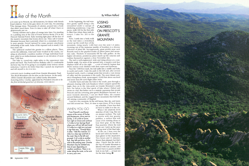 WHEN YOU GO From Prescott's courthouse square at the corner of Gurley and Montezuma, drive west on Gurley .3 of a mile to Grove. Turn right on Grove and continue 1.2 miles to Iron Springs Road where you will turn left and travel 3.0 miles to a right turn just past a sign that says, "Granite Basin 4 miles." Take this road for 3.2 miles to a stop sign and fork in the road. Stay to the left and proceed .5 of a mile to another fork. Stay left and drive .4 of a mile to the parking area. Granite Mountain may be climbed any time of year depending on weather conditions. There is no water along the route, so be sure to carry your own.
