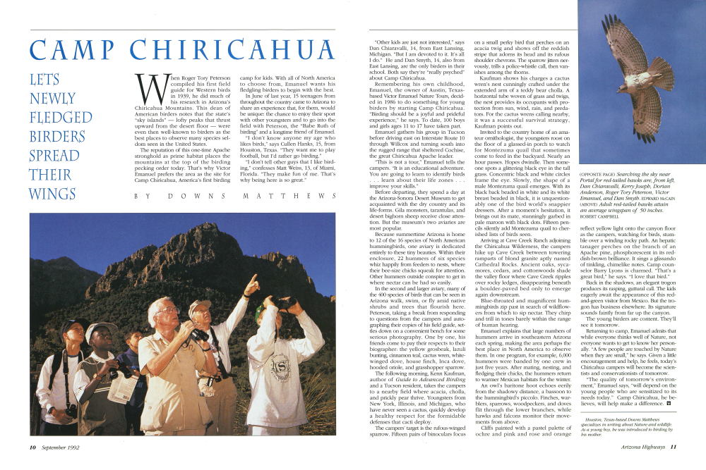 When Roger Tory Peterson compiled his first field guide for Western birds in 1939, he did much of his research in Arizona's Chiricahua Mountains. This dean of American birders notes that the state's "sky islands" - lofty peaks that thrust upward from the desert floor were even then well-known to birders as the best places to observe many species seldom seen in the United States. The reputation of this one-time Apache stronghold as prime habitat places the mountains at the top of the birding pecking order today. That's why Victor Emanuel prefers the area as the site for Camp Chiricahua, America's first birdingcamp for kids. With all of North America to choose from, Emanuel wants his fledgling birders to begin with the best. In June of last year, 15 teenagers from throughout the country came to Arizona to share an experience that, for them, would be unique: the chance to enjoy their sport with other youngsters and to go into the field with Peterson, the "Babe Ruth of birding" and a longtime friend of Emanuel. "I don't know anyone my age who likes birds," says Cullen Hanks, 15, from Houston, Texas. "They want me to play football, but I'd rather go birding." "I don't tell other guys that I like birding," confesses Matt Weiss, 13, of Miami, Florida. "They make fun of me. That's why being here is so great."