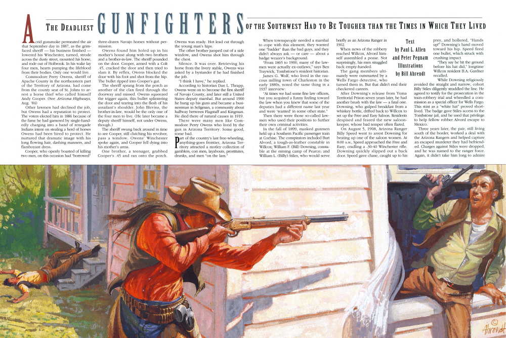 Acrid gunsmoke permeated the air that September day in 1887, as the grimfaced sheriff his business finished lowered his Winchester, turned, strode across the dusty street, mounted his horse, and rode out of Holbrook. In his wake lay four men, hearts pumping the lifeblood from their bodies. Only one would live. Commodore Perry Owens, sheriff of Apache County in the northeastern part of the Territory of Arizona, had come from the county seat of St. Johns to arrest a horse thief who called himself Andy Cooper. (See Arizona Highways, Aug. '84) Other lawmen had declined the job, but Owens had a reputation to protect. The voters elected him in 1886 because of the fame he had garnered by single-handedly charging into a band of renegade Indians intent on stealing a herd of horses Owens had been hired to protect. He nurtured that dramatic image with his long flowing hair, dashing manners, and flamboyant dress.