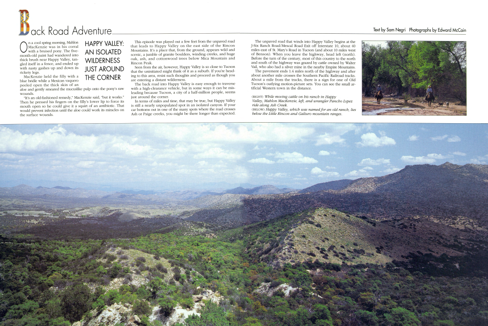 This episode was played out a few feet from the unpaved road that leads to Happy Valley on the east side of the Rincon Mountains. It's a place that, from the ground, appears wild and scenic, a jumble of granite boulders, winding creeks, and huge oak, ash, and cottonwood trees below Mica Mountain and Rincon Peak.
