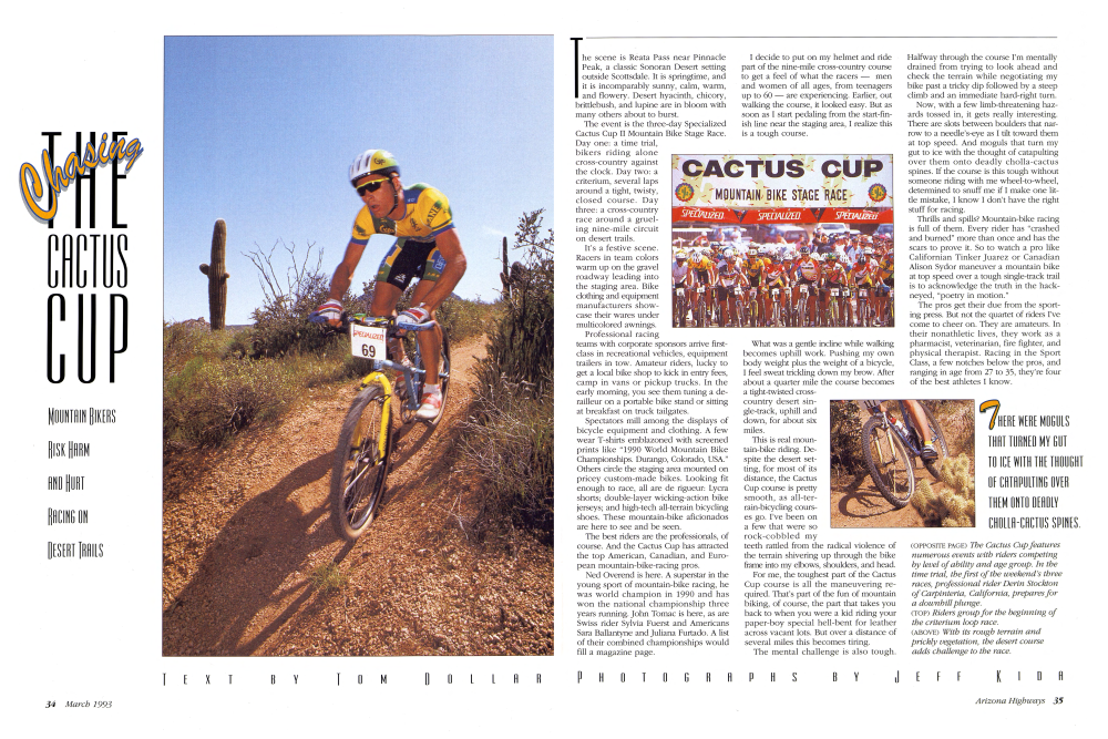 The event is the three-day Specialized Cactus Cup II Mountain Bike Stage Race. Day one: a time trial, bikers riding alone cross-country against the clock. Day two: a criterium, several laps around a tight, twisty, closed course. Day three: a cross-country race around a grueling nine-mile circuit on desert trails.