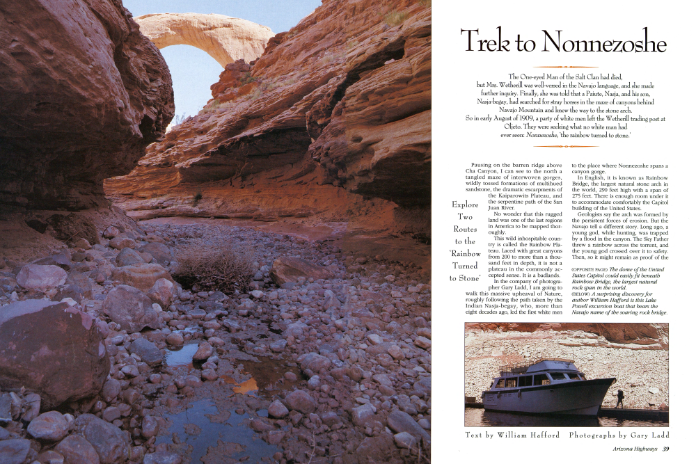 This wild inhospitable country is called the Rainbow Plateau. Laced with great canyons from 200 to more than a thousand feet in depth, it is not a plateau in the commonly accepted sense. It is a badlands. In the company of photographer Gary Ladd, I am going to walk this massive upheaval of Nature, roughly following the path taken by the Indian Nasja-begay, who, more than eight decades ago, led the first white men to the place where Nonnezoshe spans a canyon gorge.