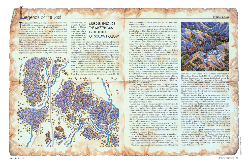The discovery of the gold ledge of Squaw Hollow was a spin-off from a massacre of Native Americans, a black page in the early history of Arizona Territory. In addition, two of Arizona's most notable pioneers, King S. Woolsey and John T. Alsap, were present when the rich ledge of gold was discovered in 1864. Neither circumstance helped locate the lode later. It was almost immediately "lost" as the result of yet another fight between whites and Indians. If anyone has found the Lost Mine of Squaw Hollow in the intervening years, it has not been identified as the legendary vein. King S. Woolsey was a rancher, freighter, miner, merchant, road builder, and member of the Territorial Legislature. However, he is best remembered for leading several civilian expeditions against Indians during the 1860s. Like manyfrontiersmen, he evinced a thorough dislike of Native Americans and contempt for their lives. In January, 1864, Woolsey led an army of settlers east from central Arizona where, just a few weeks later, the town of Prescott would emerge as the newly established capital of Arizona Territory. Estimates of the strength of Woolsey's party range from 12 to 60, but 30 seems a likely number. The group's primary mission was to exterminate Indians, a goal generally accepted by white settlers, who had been subject to frequent deadly raids. Its secondary purpose was prospecting for minerals, making the expedition a little more promising to men who had been hanging around the rudimentary mining camps in the Bradshaw Mountains. The civilian army traveled south along the Agua Fria River to the point where Sun City is now, then went east to the Verde River, northeast of present-day Phoenix. Here a halt was called for a few days while a small party went south to obtain supplies from Pima villages on the Gila River. The returning supply party was accompanied by 14