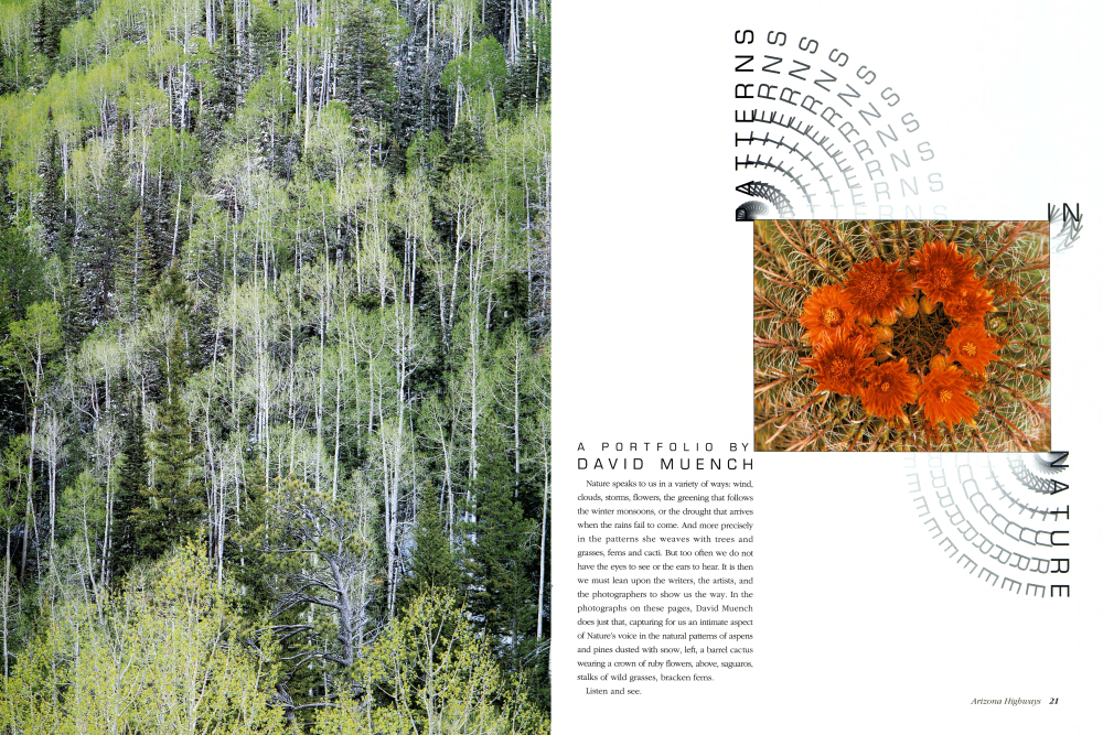 Nature speaks to us in a variety of ways: wind, clouds, storms, flowers, the greening that follows the winter monsoons, or the drought that arrives when the rains fail to come. And more precisely in the patterns she weaves with trees and grasses, ferns and cacti. But too often we do not have the eyes to see or the ears to hear. It is then we must lean upon the writers, the artists, and the photographers to show us the way. In the photographs on these pages, David Muench does just that, capturing for us an intimate aspect of Nature's voice in the natural patterns of aspens and pines dusted with snow, left, a barrel cactus wearing a crown of ruby flowers, above, saguaros, stalks of wild grasses, bracken ferns. Listen and see.