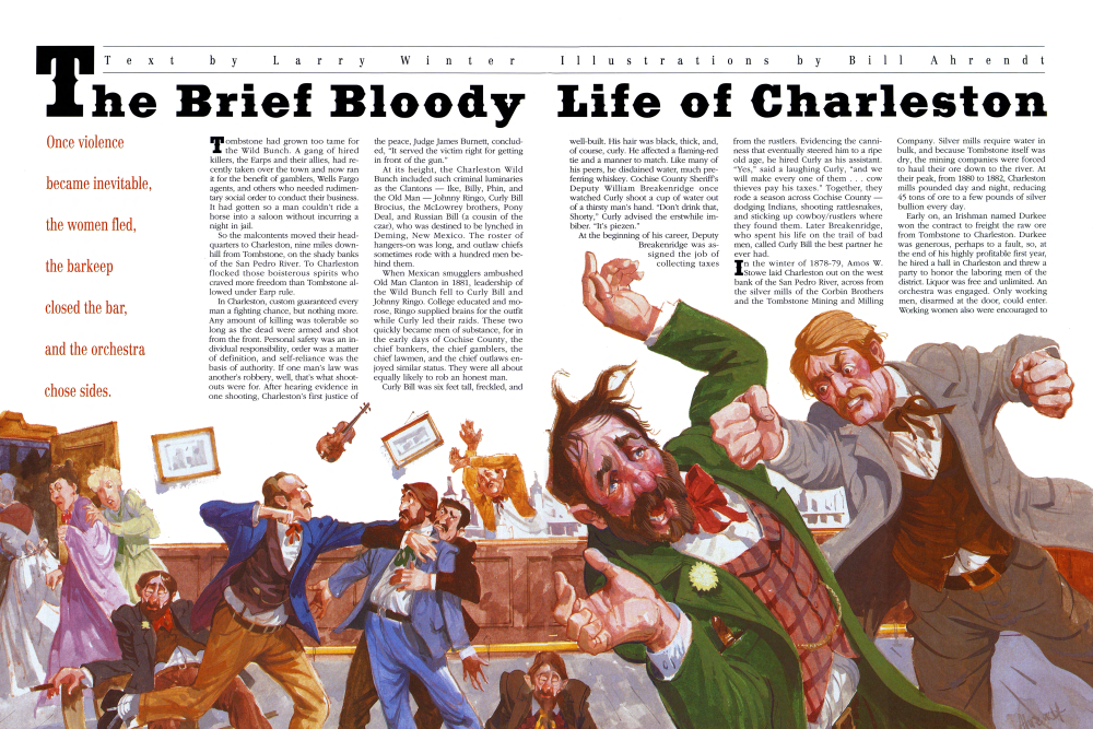 Early on, an Irishman named Durkee won the contract to freight the raw ore from Tombstone to Charleston. Durkee was generous, perhaps to a fault, so, at the end of his highly profitable first year, he hired a hall in Charleston and threw a party to honor the laboring men of the district. Liquor was free and unlimited. An orchestra was engaged. Only working men, disarmed at the door, could enter. Working women also were encouraged to attend, but no tinhorn gamblers or gunfighters, no lawyers, bookkeepers, or bosses were invited.