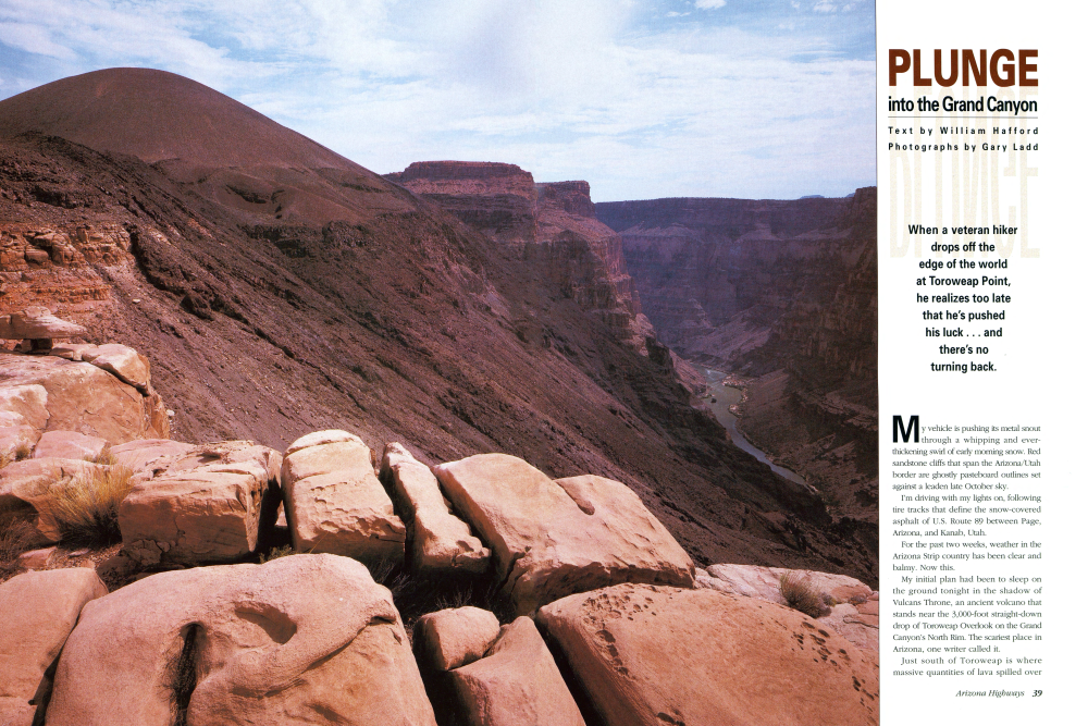 Text by William Hafford Photographs by Gary Ladd When a veteran hiker drops off the edge of the world at Toroweap Point, he realizes too late that he's pushed his luck . . . and there's no turning back.