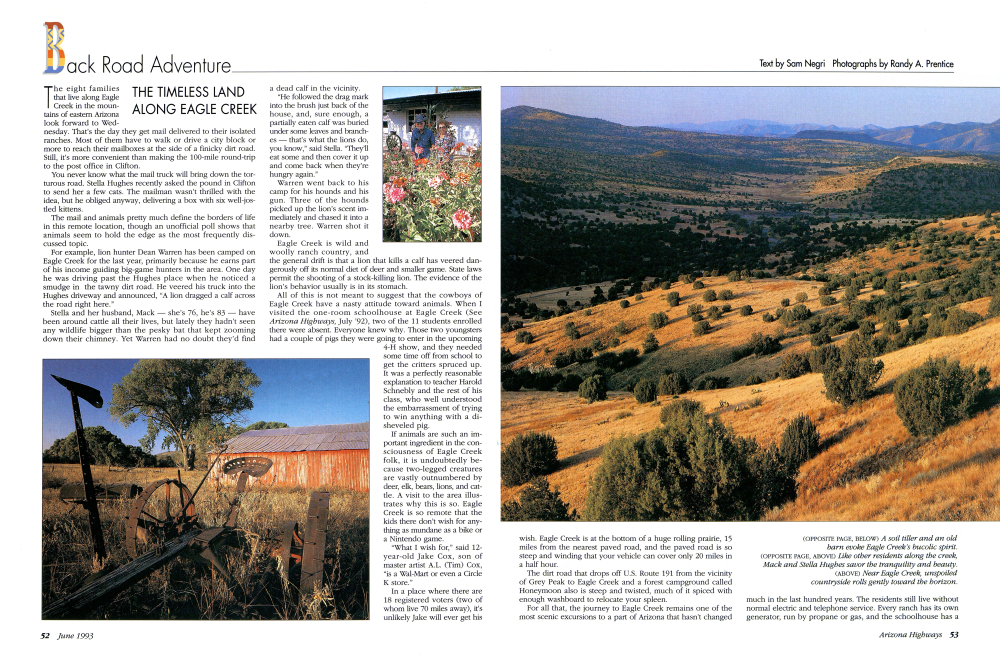 For all that, the journey to Eagle Creek remains one of the most scenic excursions to a part of Arizona that hasn't changed much in the last hundred years. The residents still live without normal electric and telephone service. Every ranch has its own generator, run by propane or gas, and the schoolhouse has a telephone hooked up to a car battery that can bounce a message off a transmitter in the high mountains to the east.