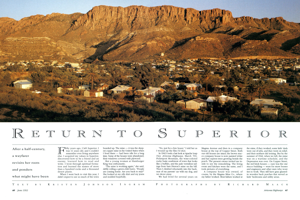 After a half-century, a wayfarer revisits her roots and ponders what might have been Fifty years ago, I left Superior. I was 11 years old, and I couldn't remember ever living anywhere else. I acquired my values in Superior, discovered how to be a friend and an enemy, learned how to read and write. I went through spiritual formation and learned the names of more than a hundred rocks and a thousand desert plants. When I went back to visit this year, I didn't expect to see so much of the town boarded up. The mine - it was the deepest copper mine in the United States when I lived there had been idle for a long time. Some of the houses were abandoned, their windows covered with plywood. But a young woman at Hamburger King was enthusiastic. "The mine is working again," she said, deftly rolling a green-chili burro. "People are coming home. Are you back to stay?" She looked at my silk shirt and my jeans and nodded hopefully.