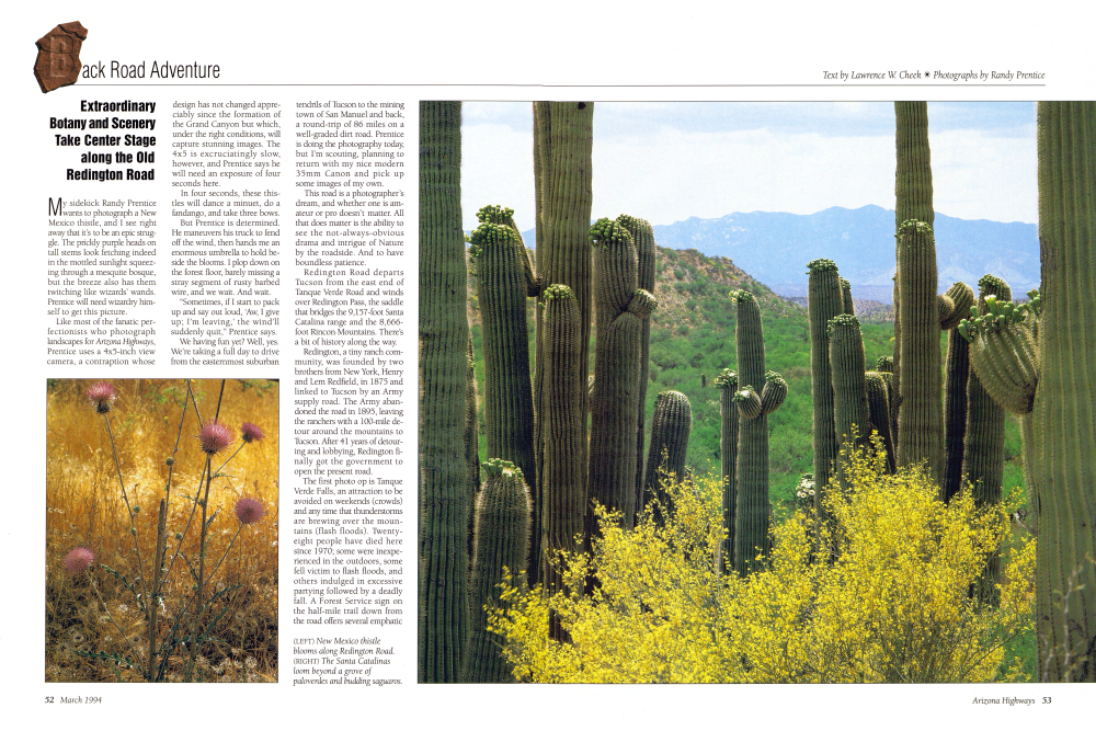 Redington Road departs Tucson from the east end of Tanque Verde Road and winds over Redington Pass, the saddle that bridges the 9,157-foot Santa Catalina range and the 8,666foot Rincon-Mountains. There's a bit of history along the way.