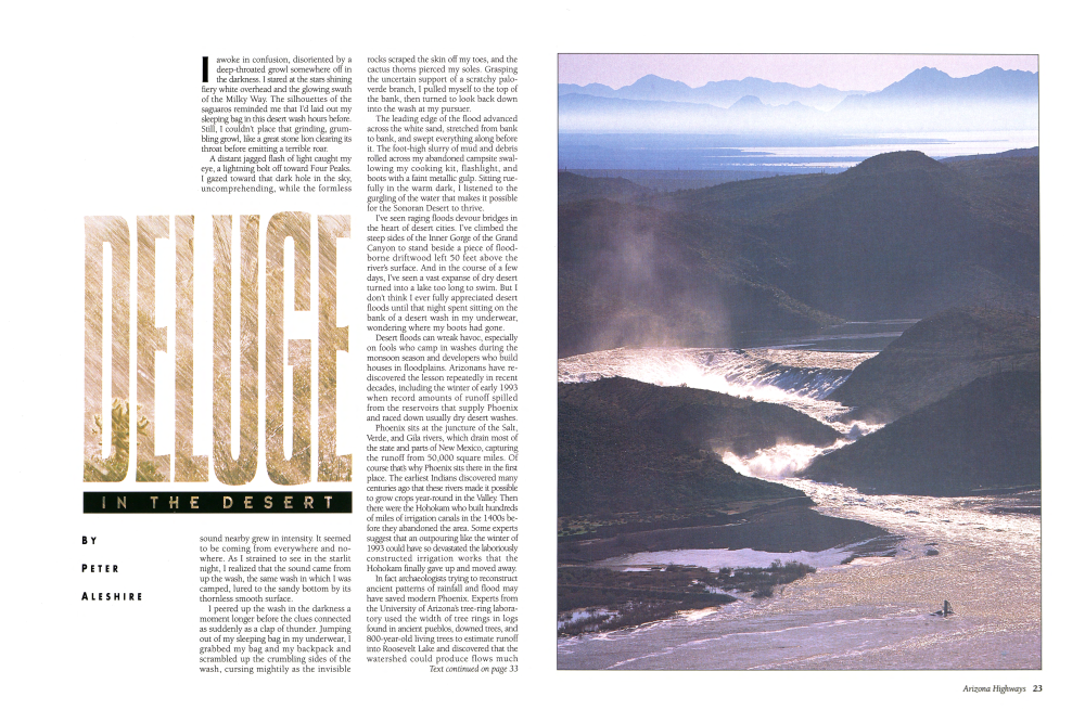 I awoke in confusion, disoriented by a deep-throated growl somewhere off in the darkness. I stared at the stars shining fiery white overhead and the glowing swath of the Milky Way. The silhouettes of the saguaros reminded me that I'd laid out my sleeping bag in this desert wash hours before. Still, I couldn't place that grinding, grumbling growl, like a great stone lion clearing its throat before emitting a terrible roar. A distant jagged flash of light caught my eye, a lightning bolt off toward Four Peaks. I gazed toward that dark hole in the sky, uncomprehending, while the formless sound nearby grew in intensity. It seemed to be coming from everywhere and nowhere. As I strained to see in the starlit night, I realized that the sound came from up the wash, the same wash in which I was camped, lured to the sandy bottom by its thornless smooth surface. I peered up the wash in the darkness a moment longer before the clues connected as suddenly as a clap of thunder. Jumping out of my sleeping bag in my underwear, I grabbed my bag and my backpack and scrambled up the crumbling sides of the wash, cursing mightily as the invisible rocks scraped the skin off my toes, and the cactus thorns pierced my soles. Grasping the uncertain support of a scratchy paloverde branch, I pulled myself to the top of the bank, then turned to look back down into the wash at my pursuer. The leading edge of the flood advanced across the white sand, stretched from bank to bank, and swept everything along before it. The foot-high slurry of mud and debris rolled across my abandoned campsite swallowing my cooking kit, flashlight, and boots with a faint metallic gulp. Sitting ruefully in the warm dark, I listened to the gurgling of the water that makes it possible for the Sonoran Desert to thrive. I've seen raging floods devour bridges in the heart of desert cities. I've climbed the steep sides of the Inner Gorge of the Grand Canyon to stand beside a piece of floodborne driftwood left 50 feet above the river's surface. And in the course of a few days, I've seen a vast expanse of dry desert turned into a lake too long to swim. But I don't think I ever fully appreciated desert floods until that night spent sitting on the bank of a desert wash in my underwear, wondering where my boots had gone. Desert floods can wreak havoc, especially on fools who camp in washes during the monsoon season and developers who build houses in floodplains. Arizonans have rediscovered the lesson repeatedly in recent decades, including the winter of early 1993 when record amounts of runoff spilled from the reservoirs that supply Phoenix and raced down usually dry desert washes. Phoenix sits at the juncture of the Salt, Verde, and Gila rivers, which drain most of the state and parts of New Mexico, capturing the runoff from 50,000 square miles. Of course that's why Phoenix sits there in the first place. The earliest Indians discovered many centuries ago that these rivers made it possible to grow crops year-round in the Valley. Then there were the Hohokam who built hundreds of miles of irrigation canals in the 1400s before they abandoned the area. Some experts suggest that an outpouring like the winter of 1993 could have so devastated the laboriously constructed irrigation works that the Hohokam finally gave up and moved away. In fact archaeologists trying to reconstruct ancient patterns of rainfall and flood may have saved modern Phoenix. Experts from the University of Arizona's tree-ring laboratory used the width of tree rings in logs found in ancient pueblos, downed trees, and 800-year-old living trees to estimate runoff into Roosevelt Lake and discovered that the watershed could produce flows much