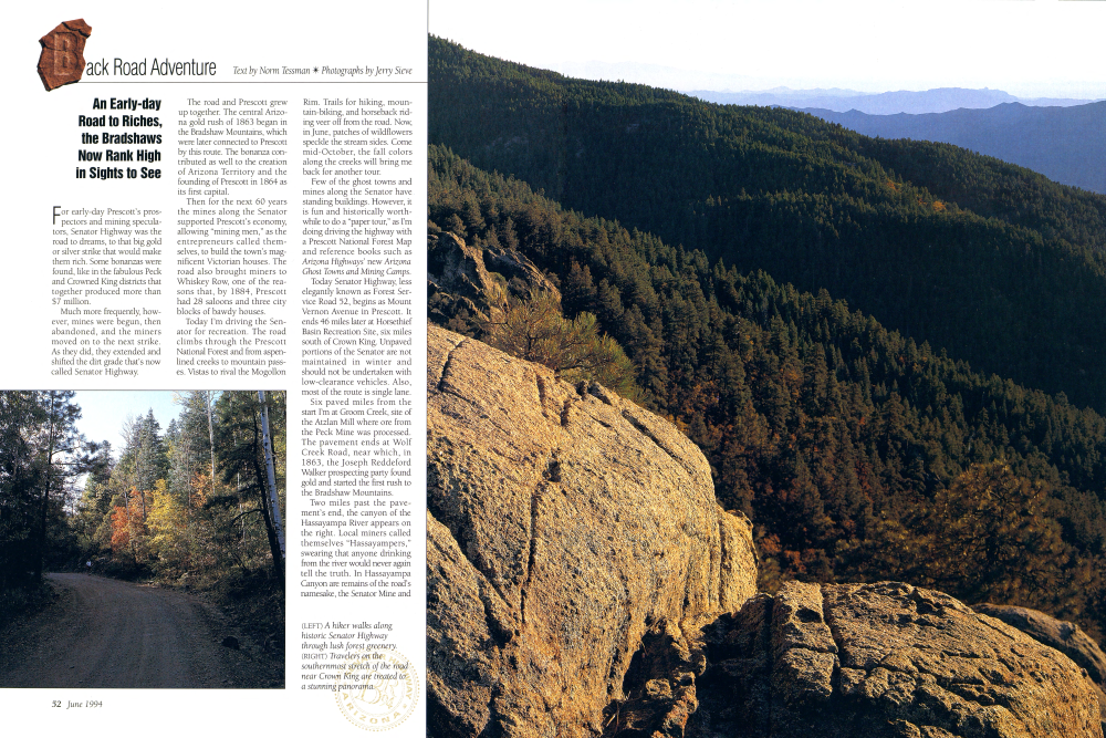 Today Senator Highway, less elegantly known as Forest Service Road 52, begins as Mount Vernon Avenue in Prescott. It ends 46 miles later at Horsethief Basin Recreation Site, six miles south of Crown King. Unpaved portions of the Senator are not maintained in winter and should not be undertaken with low-clearance vehicles. Also, most of the route is single lane.