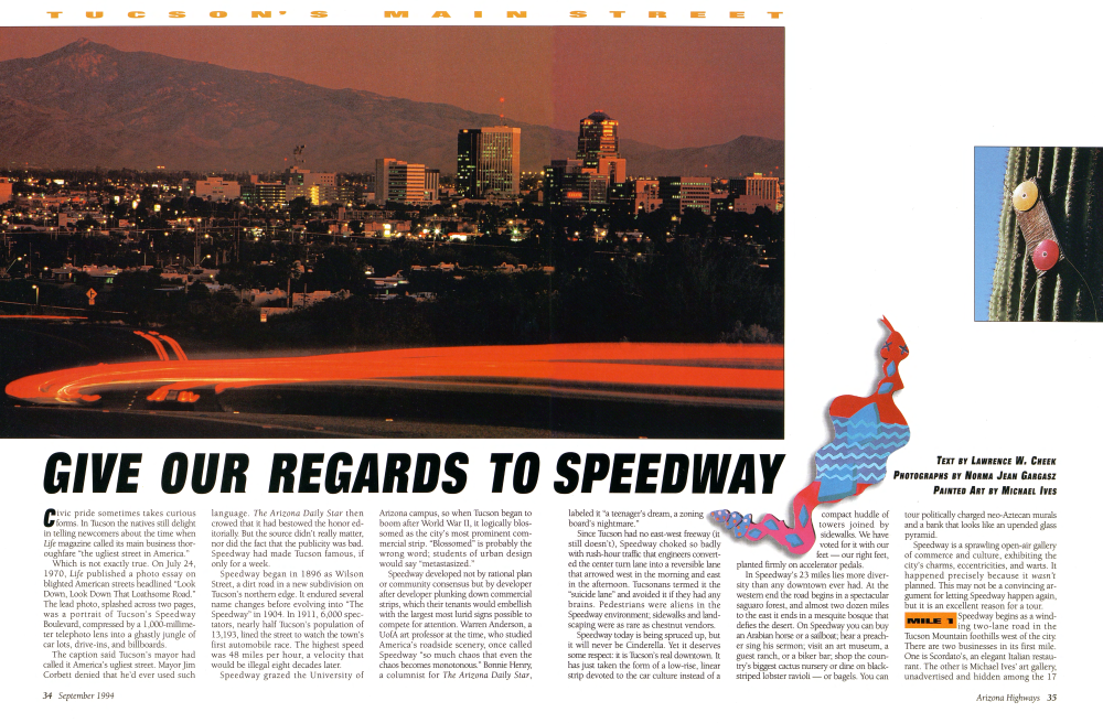 Civic pride sometimes takes curious forms. In Tucson the natives still delight in telling newcomers about the time when Life magazine called its main business thoroughfare “the ugliest street in America.” Which is not exactly true. On July 24, 1970, Life published a photo essay on blighted American streets headlined “Look Down, Look Down That Loathsome Road.” The lead photo, splashed across two pages, was a portrait of Tucson's Speedway Boulevard, compressed by a 1,000-millimeter telephoto lens into a ghastly jungle of car lots, drive-ins, and billboards. The caption said Tucson's mayor had called it America's ugliest street. Mayor Jim Corbett denied that he'd ever used suchlanguage. The Arizona Daily Star then crowed that it had bestowed the honor editorially. But the source didn't really matter, nor did the fact that the publicity was bad. Speedway had made Tucson famous, if only for a week. Speedway began in 1896 as Wilson Street, a dirt road in a new subdivision on Tucson's northern edge. It endured several name changes before evolving into “The Speedway” in 1904. In 1911, 6,000 spectators, nearly half Tucson's population of 13,193, lined the street to watch the town's first automobile race. The highest speed was 48 miles per hour, a velocity that would be illegal eight decades later. Speedway grazed the University ofArizona campus, so when Tucson began to boom after World War II, it logically blossomed as the city's most prominent commercial strip. “Blossomed” is probably the wrong word; students of urban design would say “metastasized.” Speedway developed not by rational plan or community consensus but by developer after developer plunking down commercial strips, which their tenants would embellish with the largest most lurid signs possible to compete for attention. Warren Anderson, a UofA art professor at the time, who studied America's roadside scenery, once called Speedway “so much chaos that even the chaos becomes monotonous.” Bonnie Henry, a columnist for The Arizona Daily Star, language. The Arizona Daily Star then crowed that it had bestowed the honor editorially. But the source didn't really matter, nor did the fact that the publicity was bad. Speedway had made Tucson famous, if only for a week. Speedway began in 1896 as Wilson Street, a dirt road in a new subdivision on Tucson's northern edge. It endured several name changes before evolving into “The Speedway” in 1904. In 1911, 6,000 spectators, nearly half Tucson's population of 13,193, lined the street to watch the town's first automobile race. The highest speed was 48 miles per hour, a velocity that would be illegal eight decades later. Speedway grazed the University of Arizona campus, so when Tucson began to boom after World War II, it logically blossomed as the city's most prominent commercial strip. “Blossomed” is probably the wrong word; students of urban design would say “metastasized.” Speedway developed not by rational plan or community consensus but by developer after developer plunking down commercial strips, which their tenants would embellish with the largest most lurid signs possible to compete for attention. Warren Anderson, a UofA art professor at the time, who studied America's roadside scenery, once called Speedway “so much chaos that even the chaos becomes monotonous.” Bonnie Henry, a columnist for The Arizona Daily Star,