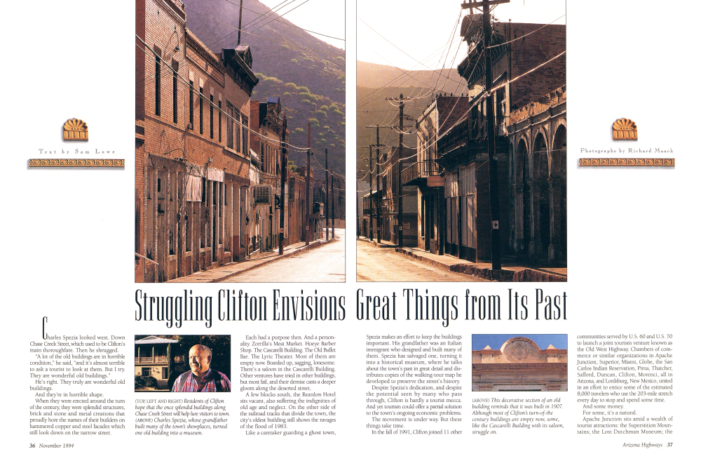 Charles Spezia looked west. Down Chase Creek Street, which used to be Clifton's main thoroughfare. Then he shrugged. "A lot of the old buildings are in horrible condition," he said, "and it's almost terrible to ask a tourist to look at them. But I try. They are wonderful old buildings." He's right. They truly are wonderful old buildings. And they're in horrible shape. When they were erected around the turn of the century, they were splendid structures, brick and stone and metal creations that proudly bore the names of their builders on hammered copper and steel facades which still look down on the narrow street. Each had a purpose then. And a personality. Zorrilla's Meat Market. Hoeye Barber Shop. The Cascarelli Building. The Old Buffet Bar. The Lyric Theater. Most of them are empty now. Boarded up, sagging, lonesome. There's a saloon in the Cascarelli Building. Other ventures have tried in other buildings, but most fail, and their demise casts a deeper gloom along the deserted street. A few blocks south, the Reardon Hotel sits vacant, also suffering the indignities of old age and neglect. On the other side of the railroad tracks that divide the town, the city's oldest building still shows the ravages of the flood of 1983. Like a caretaker guarding a ghost town,