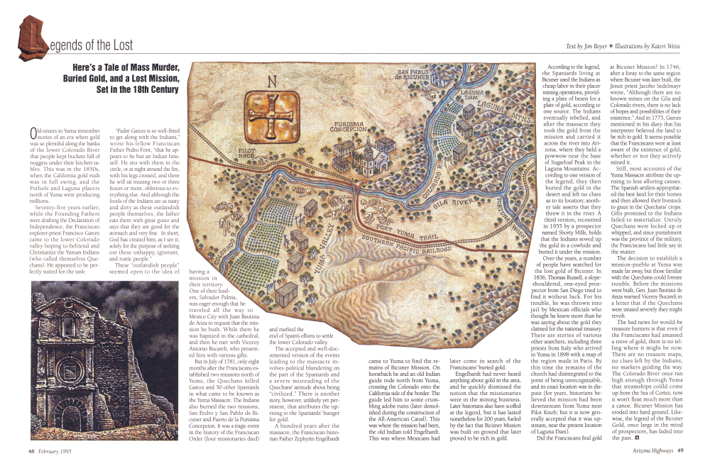 A hundred years after the massacre, the Franciscan histo-rian Father Zephyrin Engelhardt came to Yuma to find the remains of Bicuner Mission. On horseback he and an old Indian guide rode north from Yuma, crossing the Colorado onto the California side of the border. The guide led him to some crumbling adobe ruins (later demolished during the construction of the All-American Canal). This was where the mission had been, the old Indian told Engelhardt. This was where Mexicans had later come in search of the Franciscans' buried gold. Engelhardt had never heard anything about gold in the area, and he quickly dismissed the notion that the missionaries were in the mining business. Later historians also have scoffed at the legend, but it has lasted nonetheless for 200 years, fueled by the fact that Bicuner Mission was built on ground that later proved to be rich in gold.