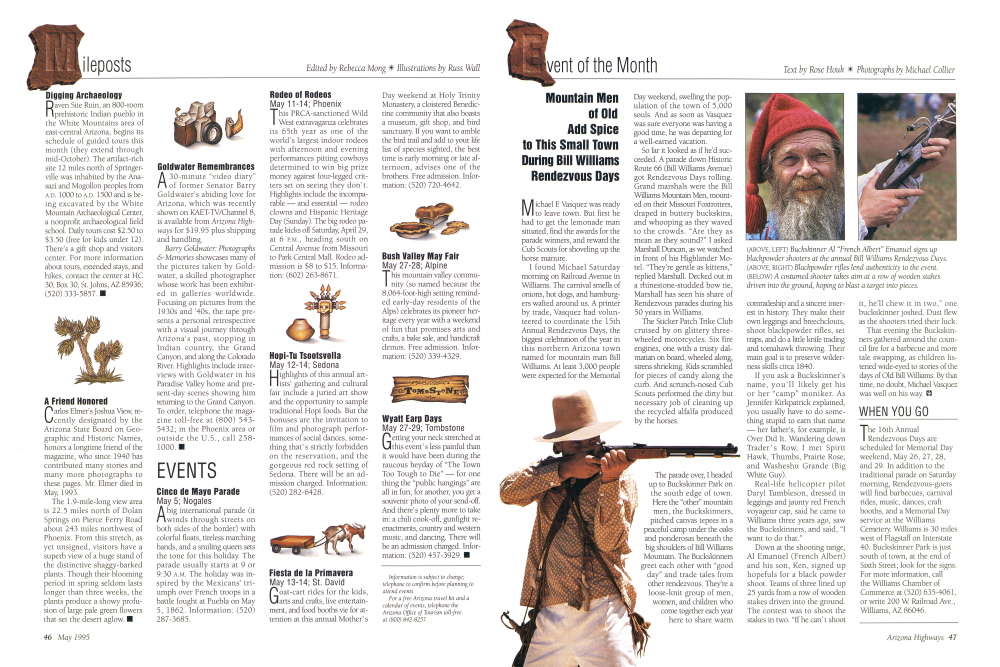 May 27-28; Alpine This mountain valley community (so named because the 8,064-foot-high setting reminded early-day residents of the Alps) celebrates its pioneer heritage every year with a weekend of fun that promises arts and crafts, a bake sale, and handicraft demos. Free admission. Information: (520) 339-4329.