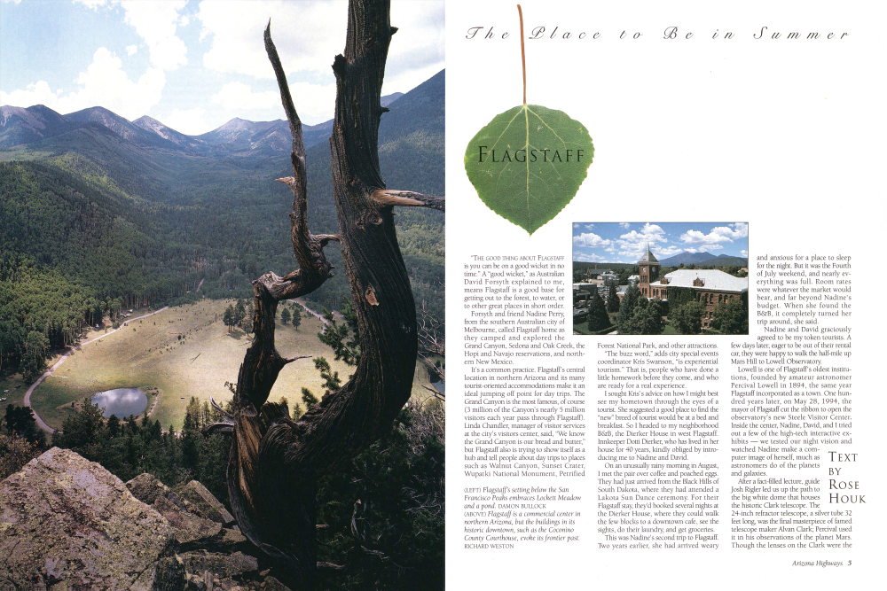 "THE GOOD THING ABOUT FLAGSTAFF is you can be on a good wicket in no time." A "good wicket," as Australian David Forsyth explained to me, means Flagstaff is a good base for getting out to the forest, to water, or to other great places in short order. Forsyth and friend Nadine Perry, from the southern Australian city of Melbourne, called Flagstaff home as they camped and explored the Grand Canyon, Sedona and Oak Creek, the Hopi and Navajo reservations, and northern New Mexico. It's a common practice. Flagstaff's central location in northern Arizona and its many tourist-oriented accommodations make it an ideal jumping off point for day trips. The Grand Canyon is the most famous, of course (3 million of the Canyon's nearly 5 million visitors each year pass through Flagstaff). Linda Chandler, manager of visitor services at the city's visitors center, said, "We know the Grand Canyon is our bread and butter," but Flagstaff also is trying to show itself as a hub and tell people about day trips to places such as Walnut Canyon, Sunset Crater, Wupatki National Monument, Petrified Forest National Park, and other attractions. "The buzz word," adds city special events coordinator Kris Swanson, "is experiential tourism." That is, people who have done a little homework before they come, and who are ready for a real experience. I sought Kris's advice on how I might best see my hometown through the eyes of a tourist. She suggested a good place to find the "new" breed of tourist would be at a bed and breakfast. So I headed to my neighborhood B&B, the Dierker House in west Flagstaff. Innkeeper Dotti Dierker, who has lived in her house for 40 years, kindly obliged by introducing me to Nadine and David.