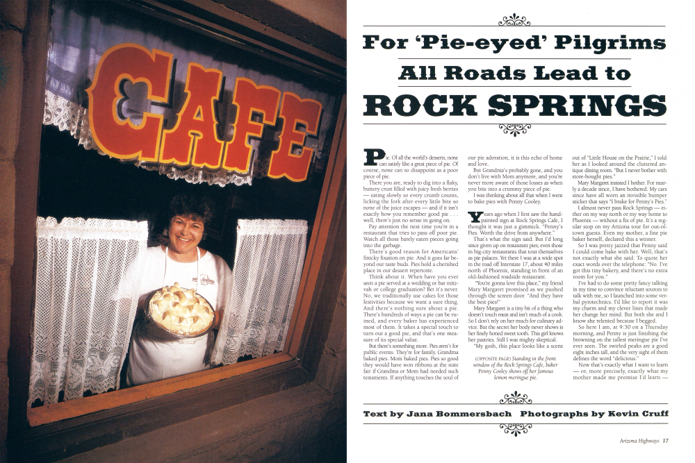 Years ago when I first saw the handpainted sign at Rock Springs Cafe, I thought it was just a gimmick. “Penny's Pies. Worth the drive from anywhere.” That's what the sign said. But I'd long since given up on restaurant pies; even those in big-city restaurants that tout themselves as pie palaces. Yet there I was at a wide spot in the road off Interstate 17, about 40 miles north of Phoenix, standing in front of an old-fashioned roadside restaurant. “You're gonna love this place,” my friend Mary Margaret promised as we pushed through the screen door. “And they have the best pies!” Mary Margaret is a tiny bit of a thing who doesn't touch meat and isn't much of a cook. So I don't rely on her much for culinary advice. But the secret her body never shows is her finely honed sweet tooth. This girl knows her pastries. Still I was mighty skeptical. “My gosh, this place looks like a scene out of “Little House on the Prairie,” I told her as I looked around the cluttered antique dining room. “But I never bother with store-bought pies.” Mary Margaret insisted I bother. For nearly a decade since, I have bothered. My cars since have all worn an invisible bumper sticker that says “I brake for Penny's Pies.” I almost never pass Rock Springs either on my way north or my way home to Phoenix without a fix of pie. It's a regular stop on my Arizona tour for out-oftown guests. Even my mother, a fine pie baker herself, declared this a winner. So I was pretty jazzed that Penny said I could come bake with her. Well, that's not exactly what she said. To quote her exact words over the telephone: “No. I've got this tiny bakery, and there's no extra room for you.” I've had to do some pretty fancy talking in my time to convince reluctant sources to talk with me, so I launched into some verbal pyrotechnics. I'd like to report it was my charm and my clever lines that made her change her mind. But both she and I know she relented because I begged. So here I am, at 9:30 on a Thursday morning, and Penny is just finishing the browning on the tallest meringue pie I've ever seen. The swirled peaks are a good eight inches tall, and the very sight of them defines the word “delicious.” Now that's exactly what I want to learn or, more precisely, exactly what my mother made me promise I'd learn Penny's secret for tall, hold-its-shape, and never-collapse meringue.