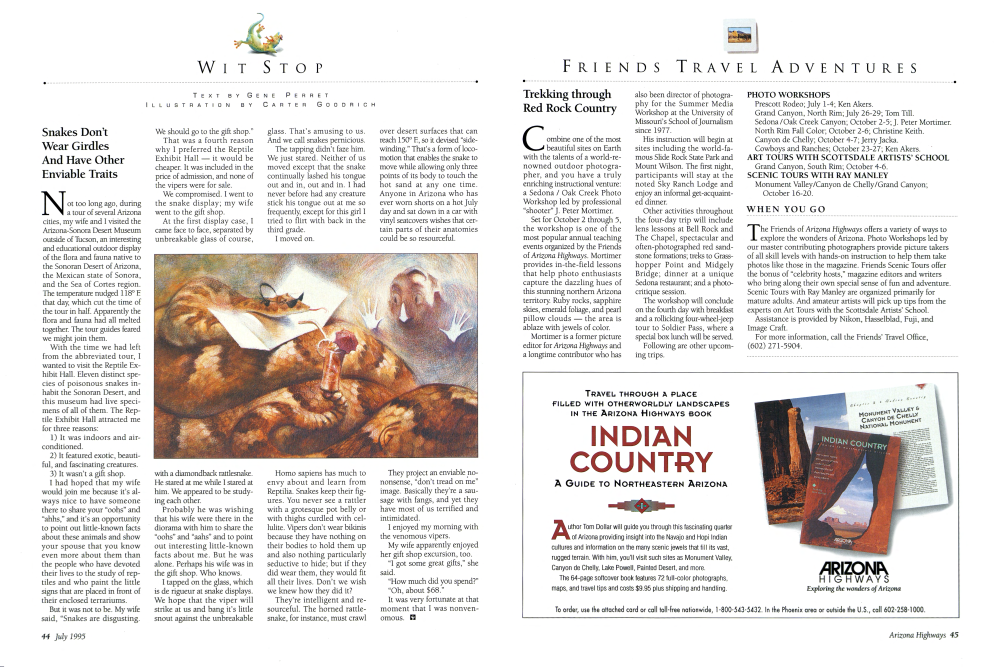 They're intelligent and resourceful. The horned rattlesnake, for instance, must crawl over desert surfaces that can reach 150° F., so it devised "sidewinding." That's a form of locomotion that enables the snake to move while allowing only three points of its body to touch the hot sand at any one time. Anyone in Arizona who has ever worn shorts on a hot July day and sat down in a car with vinyl seatcovers wishes that certain parts of their anatomies could be so resourceful. They project an enviable nononsense, "don't tread on me" image. Basically they're a sausage with fangs, and yet they have most of us terrified and intimidated.