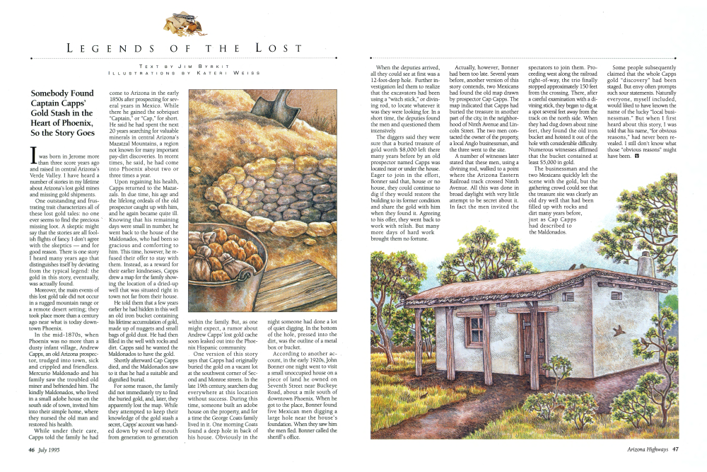 While under their care, Capps told the family he had Come to Arizona in the early 1850s after prospecting for several years in Mexico. While there he gained the sobriquet "Captain," or "Cap," for short. He said he had spent the next 20 years searching for valuable minerals in central Arizona's Mazatzal Mountains, a region not known for many important pay-dirt discoveries. In recent times, he said, he had come into Phoenix about two or three times a year. Upon regaining his health, Capps returned to the Mazatzals. In due time, his age and the lifelong ordeals of the old prospector caught up with him, and he again became quite ill. Knowing that his remaining days were small in number, he went back to the house of the Maldonados, who had been so gracious and comforting to him. This time, however, he refused their offer to stay with them. Instead, as a reward for their earlier kindnesses, Capps drew a map for the family showing the location of a dried-up well that was situated right in town not far from their house.