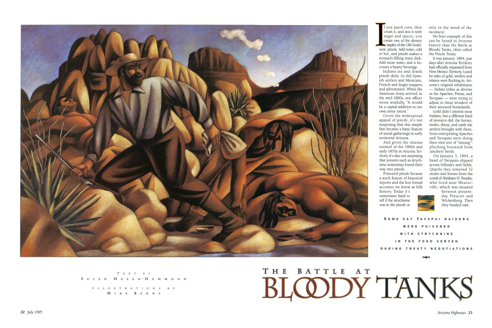 If you parch corn, then crush it, and mix it with sugar and spices, you create one of the dietary staples of the Old Southwest: pinole. Add water, cold or hot, and pinole makes a stomach-filling main dish. Add more water, and it becomes a hearty beverage. Indians ate and drank pinole daily. So did Spanish settlers and Mexicans, French and Anglo trappers and adventurers. When the American Army arrived, in the mid-1800s, one officer wrote wistfully, "It would be a capital addition to our own army ration." Given the widespread appeal of pinole, it's not surprising that this simple fare became a basic feature of social gatherings in early territorial Arizona. And given the intense turmoil of the 1860s and early 1870s in Arizona Territory, it's also not surprising that poisons such as strychnine sometimes found their way into pinole. Poisoned pinole became a stock feature of historical reports and the less formal accounts we know as folk history. Today it's sometimes hard to tell if the strychnine was in the pinole or only in the mind of the raconteur. No finer example of this can be found in Arizona history than the Battle at Bloody Tanks, often called the Pinole Treaty. It was January, 1864, just days after Arizona Territory had officially separated from New Mexico Territory. Lured by tales of gold, settlers and miners were flocking in. Arizona's original inhabitants Indian tribes as diverse as the Apaches, Pimas, and Yavapais were trying to adjust to these invaders of their ancestral homelands. Gold didn't interest most Indians, but a different kind of resource did: the horses, mules, sheep, and cattle the settlers brought with them. Soon enterprising Apaches and Yavapais were doing their own sort of "mining": plucking livestock from ranchers' herds. On January 5, 1864, a band of Yavapais slipped across hillsides and fields. Quietly they removed 32 mules and horses from the corral of Abraham H. Peeples, who lived near Weaverville, which was situated between presentday Prescott and Wickenburg. Then they headed east.