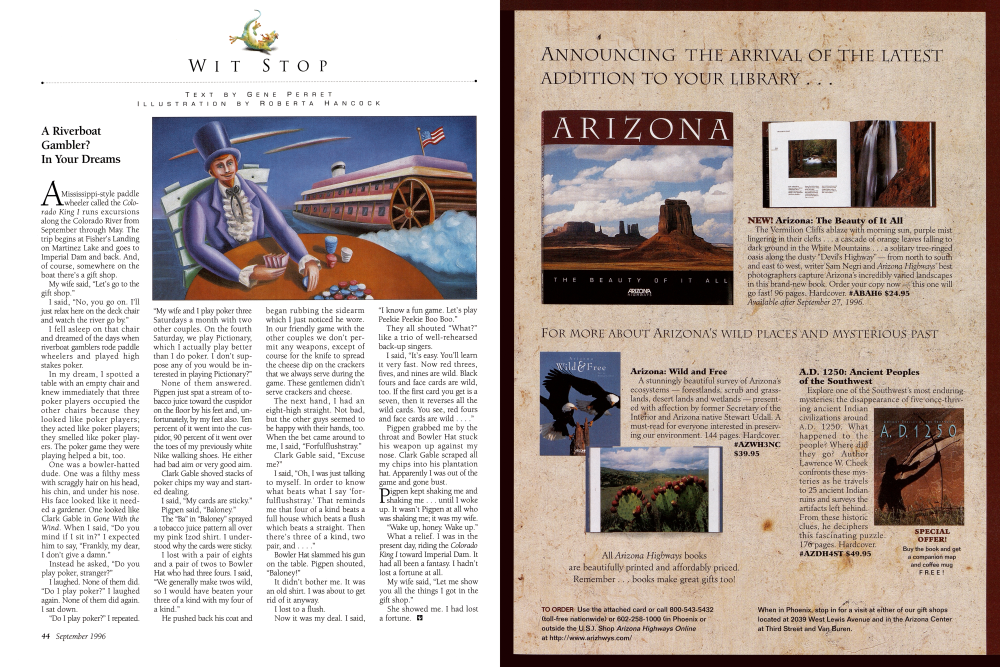 The Vermilion Cliffs ablaze with morning sun, purple mist lingering in their clefts . . . a cascade of orange leaves falling to dark ground in the White Mountains . . . a solitary tree-ringed oasis along the dusty "Devil's Highway" - from north to south and east to west, writer Sam Negri and Arizona Highways' best photographers capture Arizona's incredibly varied landscapes in this brand-new book. Order your copy now this one will go fast! 96 pages. Hardcover. #ABAH6 $24.95 Available after September 27, 1996.