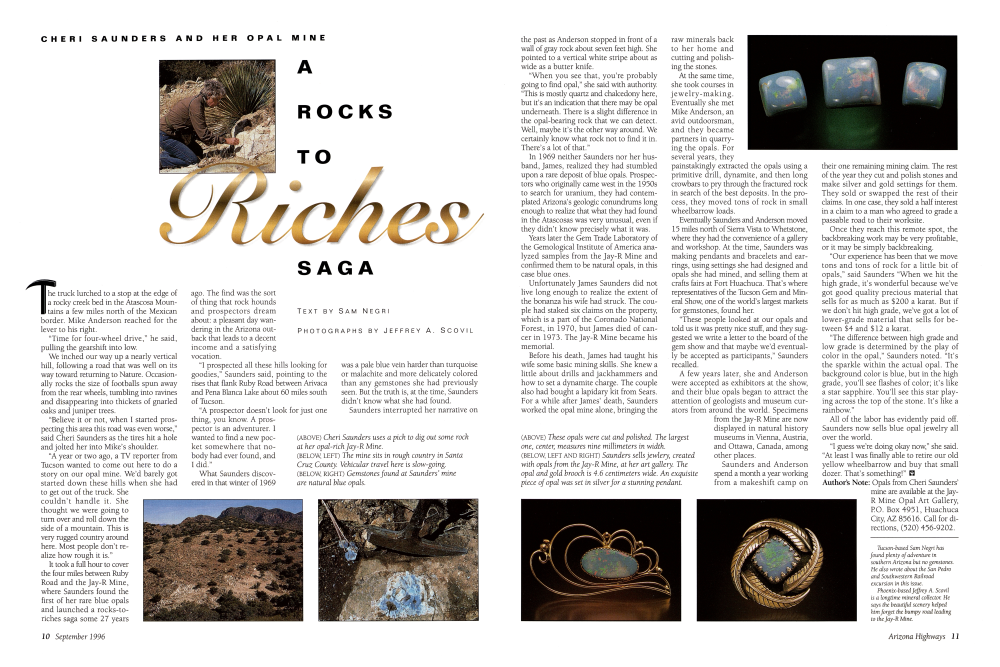 It took a full hour to cover the four miles between Ruby Road and the Jay-R Mine, where Saunders found the first of her rare blue opals and launched a rocks-to-riches saga some 27 years ago. The find was the sort of thing that rock hounds and prospectors dream about: a pleasant day wandering in the Arizona outback that leads to a decent income and a satisfying vocation.