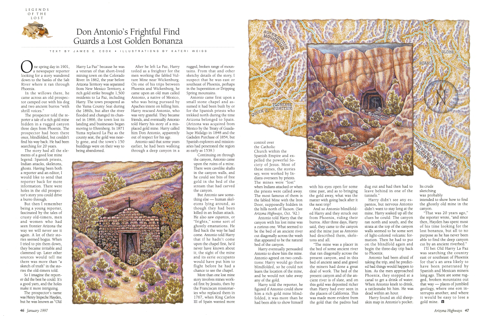 More than one lost mine story involves mines worked first by Jesuits, then by the Franciscan missionaries who replaced them in 1767, when King Carlos III of Spain wanted more control over the Catholic Church within the Spanish Empire and expelled the powerful Society of Jesus. Most of these mines, the stories say, were worked by Indians overseen by priests. The mines were "lost" when Indians attacked or when the priests were called away. The most famous of them is the fabled Mine with the Iron Door, supposedly hidden in the hills north of Tucson. (See Arizona Highways, Oct. '92.) Antonio told Harry that the canyon with his lost mine was a curious one. What seemed to be the bed of an ancient river cut diagonally across the wash that appeared to be the natural bed of the canyon.Harry eventually persuaded Antonio to show him the mine. Antonio agreed on two conditions: Harry would go there blindfolded, so he could not learn the location of the mine, and he would not take away any of the gold.