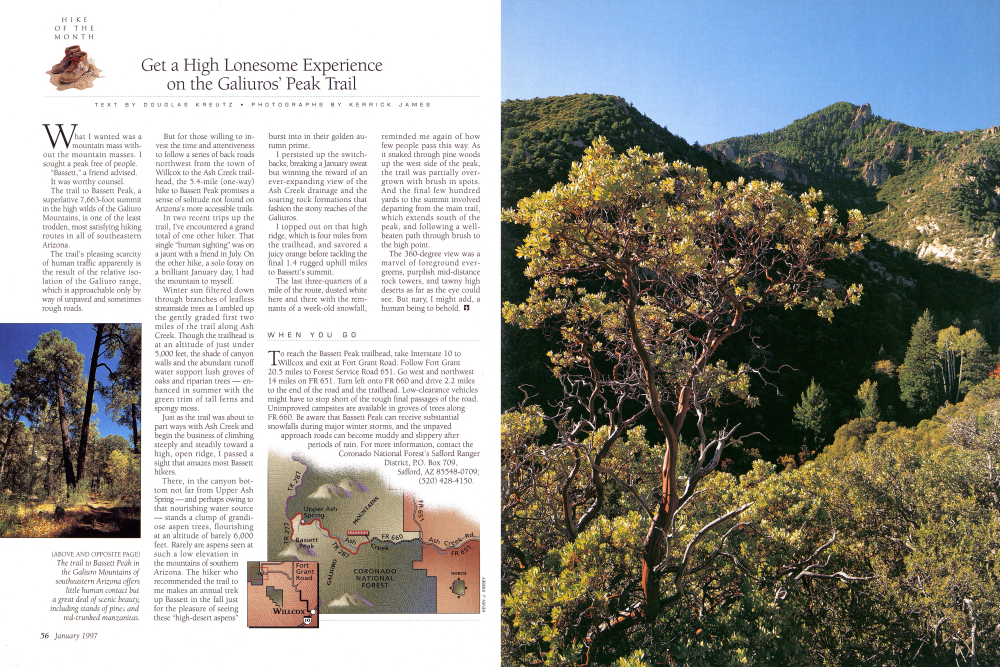 What I wanted was a mountain mass without the mountain masses. I sought a peak free of people. "Bassett," a friend advised. It was worthy counsel. The trail to Bassett Peak, a superlative 7,663-foot summit in the high wilds of the Galiuro Mountains, is one of the least trodden, most satisfying hiking routes in all of southeastern Arizona. The trail's pleasing scarcity of human traffic apparently is the result of the relative isolation of the Galiuro range, which is approachable only by way of unpaved and sometimes rough roads. But for those willing to invest the time and attentiveness to follow a series of back roads northwest from the town of Willcox to the Ash Creek trailhead, the 5.4-mile (one-way) hike to Bassett Peak promises a sense of solitude not found on Arizona's more accessible trails. In two recent trips up the trail, I've encountered a grand total of one other hiker. That single "human sighting" was on a jaunt with a friend in July. On the other hike, a solo foray on a brilliant January day, I had the mountain to myself. Winter sun filtered down through branches of leafless streamside trees as I ambled up the gently graded first two miles of the trail along Ash Creek. Though the trailhead is at an altitude of just under 5,000 feet, the shade of canyon walls and the abundant runoff water support lush groves of oaks and riparian trees — enhanced in summer with the green trim of tall ferns and spongy moss. Just as the trail was about to part ways with Ash Creek and begin the business of climbing steeply and steadily toward a high, open ridge, I passed a sight that amazes most Bassett hikers. There, in the canyon bottom not far from Upper Ash Spring—and perhaps owing to that nourishing water source stands a clump of grandiose aspen trees, flourishing at an altitude of barely 6,000 feet. Rarely are aspens seen at such a low elevation in the mountains of southern Arizona. The hiker who recommended the trail to me makes an annual trek up Bassett in the fall just for the pleasure of seeing these "high-desert aspens"