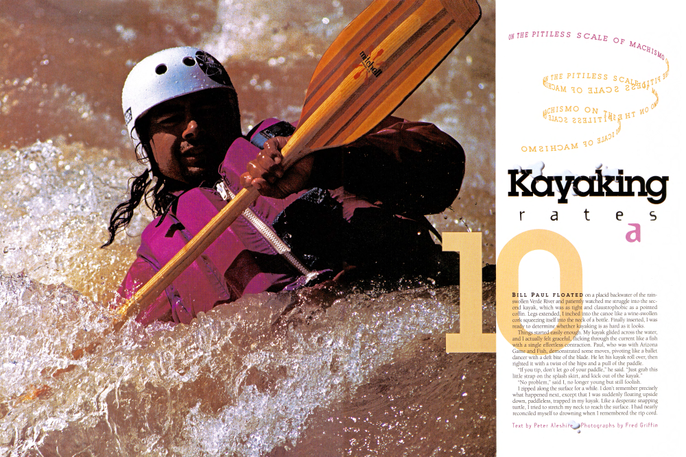 BILL PAUL FLOATED on a placid backwater of the rainswollen Verde River and patiently watched me struggle into the second kayak, which was as tight and claustrophobic as a pointed coffin. Legs extended, I inched into the canoe like a wine-swollen cork squeezing itself into the neck of a bottle. Finally inserted, I was ready to determine whether kayaking is as hard as it looks. Things started easily enough. My kayak glided across the water, and I actually felt graceful, flicking through the current like a fish with a single effortless contraction. Paul, who was with Arizona Game and Fish, demonstrated some moves, pivoting like a ballet dancer with a deft bite of the blade. He let his kayak roll over, then righted it with a twist of the hips and a pull of the paddle. "If you tip, don't let go of your paddle," he said. "Just grab this little strap on the splash skirt, and kick out of the kayak." "No problem," said I, no longer young but still foolish. I zipped along the surface for a while. I don't remember precisely what happened next, except that I was suddenly floating upside down, paddleless, trapped in my kayak. Like a desperate snapping turtle, I tried to stretch my neck to reach the surface. I had nearly reconciled myself to drowning when I remembered the rip cord.