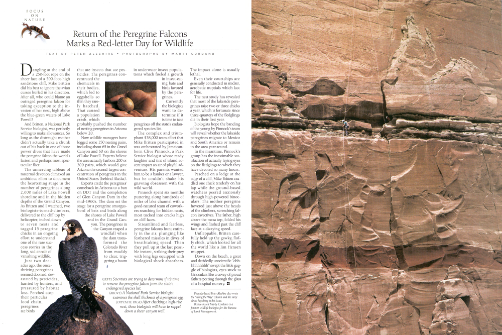 Dangling at the end of a 250-foot rope on the sheer face of a 500-foot-high sandstone cliff, Mike Britten did his best to ignore the avian curses hurled in his direction. After all, who could blame an outraged peregrine falcon for taking exception to the invasion of her nest, high above the blue-green waters of Lake Powell?