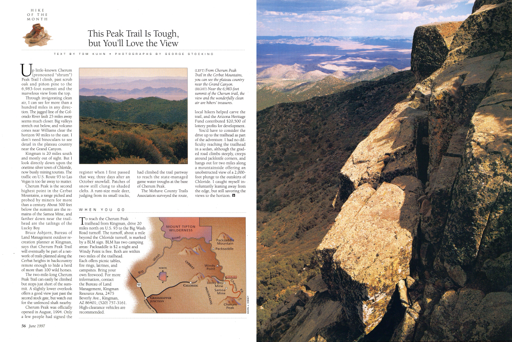 Up little-known Cherum (pronouned "shrum") Peak Trail I climb, past scrub oak and piƱon pine to the 6,983-foot summit and the marvelous view from the top. Through invigorating clean air, I can see for more than a hundred miles in any direction. The jagged line of the Colorado River fault 25 miles away seems much closer. Big valleys stretch out below, and volcano cones near Williams clear the horizon 90 miles to the east. I don't need binoculars to see detail in the plateau country near the Grand Canyon. Kingman is 20 miles south and mostly out of sight. But I look directly down upon the onetime silver town of Chloride, now busily mining tourists. The traffic on U.S. Route 93 to Las Vegas is too far away to matter. Cherum Peak is the second highest point in the Cerbat Mountains, a range picked and probed by miners for more than a century. About 500 feet below the summit are the remains of the Samoa Mine, and farther down near the trailhead are the tailings of the Lucky Boy. Bruce Asbjorn, Bureau of Land Management outdoor recreation planner at Kingman, says that Cherum Peak Trail will eventually be part of a network of trails planned along the Cerbat heights in backcountry remote enough to hide a herd of more than 100 wild horses. The two-mile-long Cherum Peak Trail can easily be climbed but stops just short of the summit. A slightly lower overlook offers a good view just past the second stock gate, but watch out for the unfenced shaft nearby. Cherum Peak was officially opened in August, 1994. Only a few people had signed the register when I first passed that way, three days after an October snowfall. Patches of snow still clung to shaded clefts. A runt-size mule deer, judging from its small tracks, had climbed the trail partway to reach the state-managed game water troughs at the base of Cherum Peak. The Mohave County Trails Association surveyed the route,