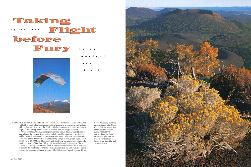J. ROBERT THOMPSON LAUNCHED HIMSELF FROM A VOLCANO TOP AND WAS SOON FLYING OVER vast fields of black ash. A dozen craters offered landmarks as he maneuvered his hang glider higher and higher over the Cinder Hills Recreation Area 14 miles northeast of Flagstaff, until finally he was forced to breathe from an oxygen cylinder. For the Glendale, Arizona, college professor and former distance record holder for hang gliders, the volcanic fields radiate updrafts ideal for sustained powerless flight, and he has ridden the winds nonstop as far as Cortez, Colorado, 230 miles away. He once gained 8,000 feet of altitude soaring alongside two golden eagles. "They pulled out at 14,000 feet," Thompson said, but flying formation with a buddy, he continued up to 17,000 feet. "We got pictures of them off our wingtips," he said. From his vantage, Thompson takes in the whole recreation area as the land spreads to the windward of Arizona's highest summit on the San Francisco Peaks, a blown-out dormant volcano that towers 12,643 feet over Flagstaff. Sprouted from