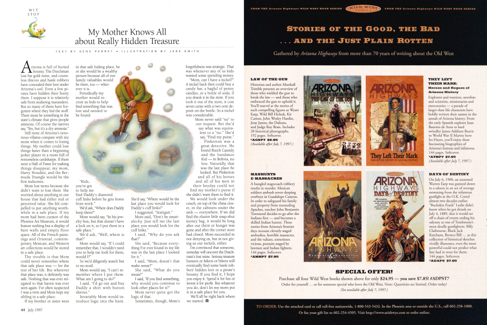 Still none of Arizona's notorious villains compare with my mom when it comes to losing things. My mother could lose things faster than a beginning poker player in a room full of remorseless cardsharps. If there were a Hall of Fame for making things disappear, my mom, Harry Houdini, and the Bermuda Triangle would be the first inductees.
