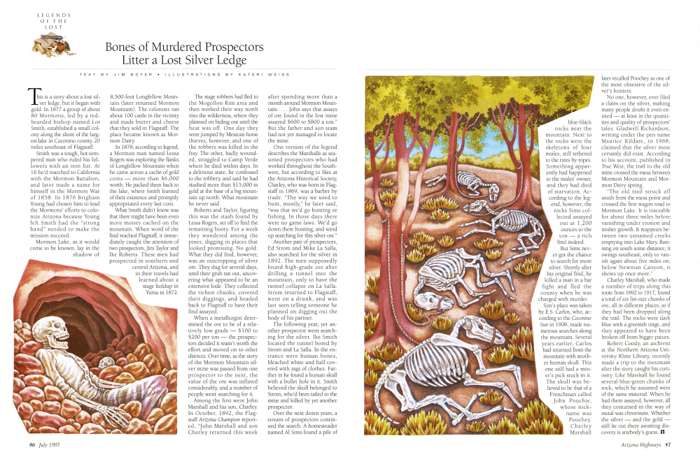 Over the next dozen years, a stream of prospectors continued the search. A homesteader named Al Sims found a pile of blue-black rocks near the mountain. Next to the rocks were the skeletons of four mules, still tethered to the trees by ropes. Something apparently had happened to the mules' owner, and they had died of starvation. According to the legend, however, the rocks Sims collected assayed out at 1,200 ounces to the ton a rich find indeed. But Sims never got the chance to search for more silver. Shortly after his original find, he killed a man in a bar fight and fled the county when he was charged with murder. Sim's place was taken by E.S. Carlos, who, according to the Coconino Sun in 1908, made numerous searches along the mountain. Several years earlier, Carlos had returned from the mountain with another human skull. This one still had a miner's pick stuck in it. The skull was believed to be that of a Frenchman called John Pouchie, whose nickname was Poochey. Charley Marshall later recalled Poochey as one of the most obsessive of the sil-ver's hunters. No one, however, ever filed a claim on the silver, making many people doubt it even ex-isted at least in the quanti-ties and quality of prospectors' tales. Gladwell Richardson, writing under the pen name Maurice Kildare, in 1968, claimed that the silver most certainly did exist. According to his account, published in True West, the trail to the old mine crossed the mesa between Mormon Mountain and Mor-mon Dairy spring. "The old trail struck off south from the mesa point and crossed the first wagon road to Mormon Lake. It is traceable for about three miles before vanishing under erosion and timber growth. It reappears be-tween two unnamed creeks emptying into Lake Mary. Run-ning on south some distance, it swings southeast, only to van-ish again about five miles on; below Newman Canyon, it shows up once more." Charley Marshall, who made a number of trips along this route from 1892 to 1917, found a total of six fist-size chunks of ore, all in different places, as if they had been dropped along the trail. The rocks were dark blue with a greenish tinge, and they appeared to have been broken off from bigger pieces. Robert Coody, an archivist at the Northern Arizona Uni-versity Kline Library, recently made a trip to the mountain after the story caught his curi-osity. Like Marshall he found several blue-green chunks of rock, which he assumed were of the same material. When he had them assayed, however, all they contained in the way of metal was chromium. Whether the silver and the gold - still lie out there awaiting dis-covery is anybody's guess.