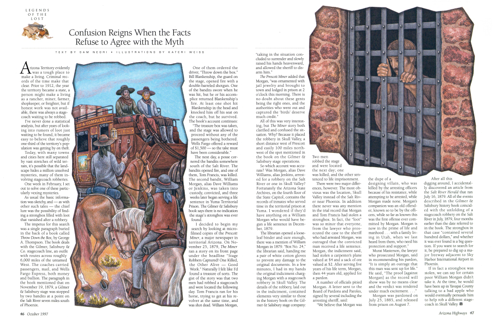 Arizona Territory evidently was a tough place to make a living. Criminal records of the time make that clear. Prior to 1912, the year the territory became a state, a person might make a living as a rancher, miner, farmer, shopkeeper, or freighter, but if honest work was not available, there was always a stagecoach waiting to be robbed. I've never done a statistical analysis, but after years of looking into rumors of loot just waiting to be found, it became easy to believe that roughly one-third of the territory's population was getting by on theft. Today, with many towns and cities here still separated by vast stretches of wild terrain, it's possible that the landscape hides a million unsolved mysteries, many of them involving stagecoach robberies. One week in February, I set out to solve one of these particularly vexing mysteries. As usual the basic information was sketchy, and - as with other such tales - the chief lure was the possibility of finding a strongbox filled with loot that vanished after a robbery. The impetus for this search was a single paragraph buried in the back of a book called Throw Down the Box, by George A. Thompson. The book deals with the Gilmer, Salisbury & Co. stagecoach line, an outfit with routes across roughly 6,000 miles of the untamed West. The coaches carried passengers, mail, and Wells Fargo Express, both money and bullion. The paragraph in the book mentioned that on November 19, 1879, a Gilmer & Salisbury stage was stopped by two bandits at a point on the Salt River seven miles south of Phoenix.