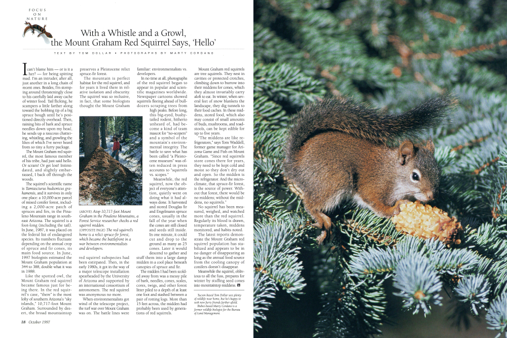 The mountain is perfect habitat for the red squirrel, and for years it lived there in relative isolation and obscurity. The squirrel was so reclusive, in fact, that some biologists thought the Mount Graham In no time at all, photographs of the red squirrel began to appear in popular and scientific magazines worldwide. Newspaper cartoons showed squirrels fleeing ahead of bulldozers scraping trees from high peaks. Before long, this big-eyed, bushytailed rodent, hitherto unheard of, had become a kind of team mascot for "no-scopers" and a symbol of the mountain's environmental integrity. The battle to save what has been called "a Pleistocene museum" was often reduced in press accounts to "squirrels vs. scopes."