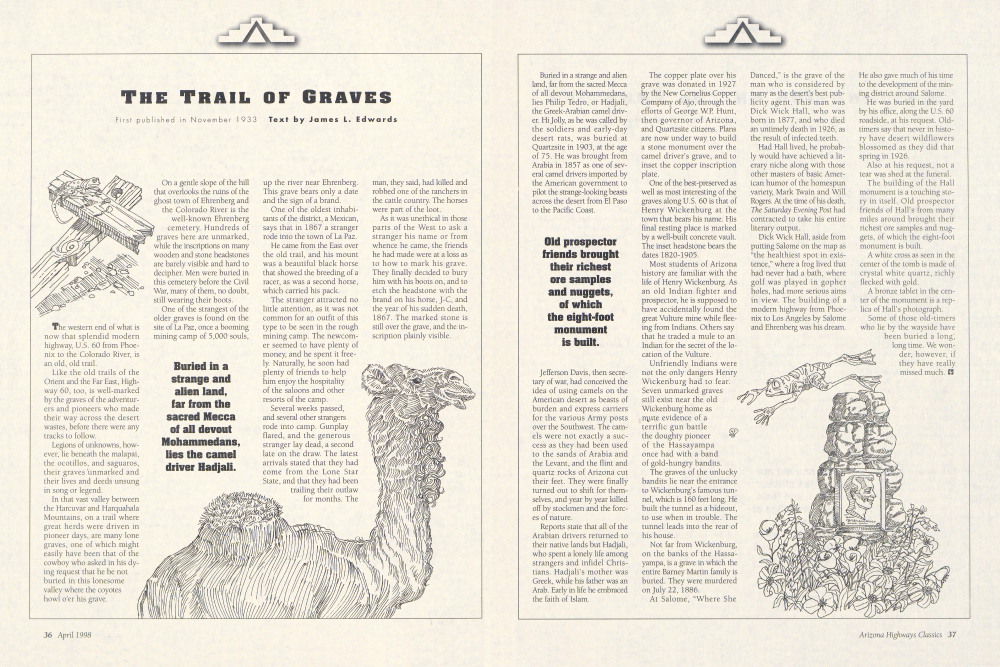 The western end of what is now that splendid modern highway, U.S. 60 from Phoenix to the Colorado River, is an old, old trail.Like the old trails of the Orient and the Far East, Highway 60, too, is well-marked by the graves of the adventurers and pioneers who made their way across the desert wastes, before there were any tracks to follow.