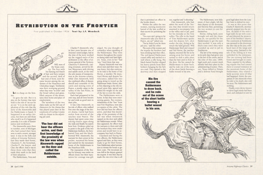 So goes the tale. But it is also on the frontier that men hold to the rule of "an eye for an eye." It is on the stern application of this rule that the story of the Ainsworths and the Haldermans is based. It happened in an earlier Arizona, but there are still those who recall it as if it happened yesterday. It is a tale of frontier justice and retribution.
