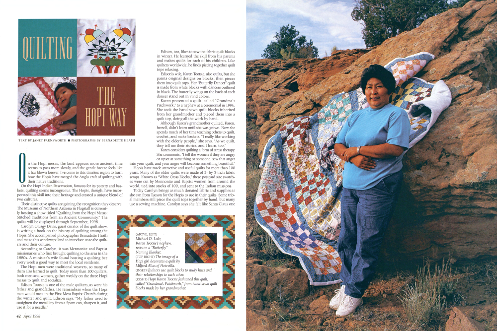 In the Hopi mesas, the land appears more ancient, time seems to pass more slowly, and the gentle breeze feels like it has blown forever. I've come to this timeless region to learn how the Hopis have merged the Anglo craft of quilting with their native traditions. On the Hopi Indian Reservation, famous for its pottery and bas-kets, quilting seems incongruous. The Hopis, though, have incorporated this skill into their heritage and created a unique blend of two cultures.
