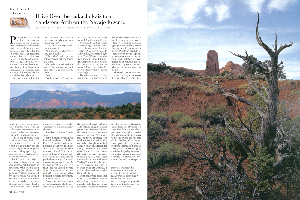 Photographer David Smith and I sat in a restaurant at Chinle on the Navajo Indian Reservation in the northeast corner of the state and discussed our plans for the following day. Our intention was to drive the north rim of Canyon de Chelly to the vicinity of Tsaile, then head west and north to Lukachukai and over the top of the Lukachukai Mountains to a sandstone arch just beyond the village of Cove and visible from the road. The map indicated all the than the Navajo waitresses in the restaurant where we were having supper? "Oh, that's a rough road," one waitress said. "Big rocks," said another. "You got a truck?" "Not today," I said. "Just an ordinary sedan, but hey, it's red and shiny."