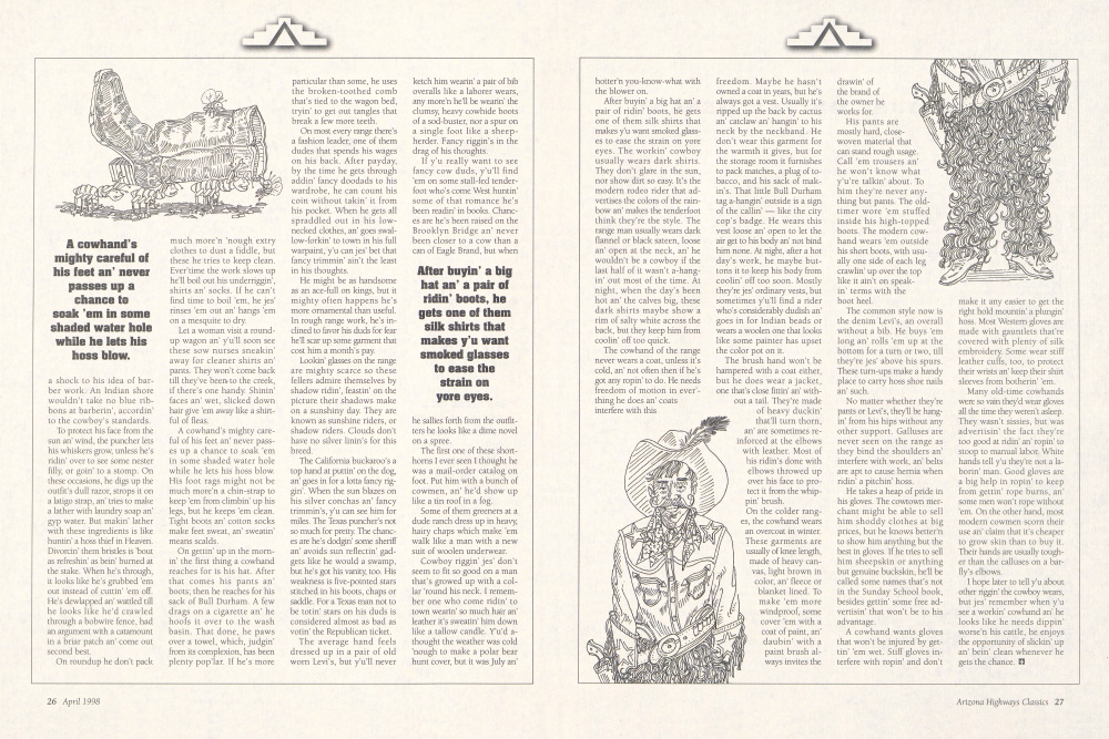 First published in September 1952 Text by Ramon F. Adams Today's Western romance writers always have their hero fresh an' handsome an' duded up like a ridin' advertisement for a leather shop. But the real cowhand don't look like no fresh daisy. Follow him for a day an' y'u'll know he's attendin' no ladies' finishin' school. His hours are long an' hot, his work hard an' dusty. With his hide soakin' up dust, the smoke of brandin' fires, The first thing he did when he hit town was to rattle his hocks for a barbershop where he could take a civilized soakin' in hot water with big woolly towels an' sweet smellin' soap.
