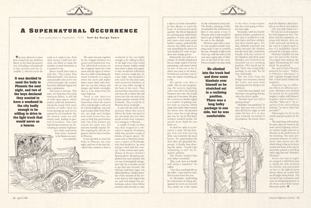 This story deserves to have been written by, say, Ambrose Bierce in his most persuasive way of lending verisimilitude to the uncanny and the incredible. I, who but recite the It was decided to send the body to Phoenix the next night, and two of the boys declared they wanted to have a weekend in the city badly enough to be willing to drive in the light truck that would serve as a hearse.