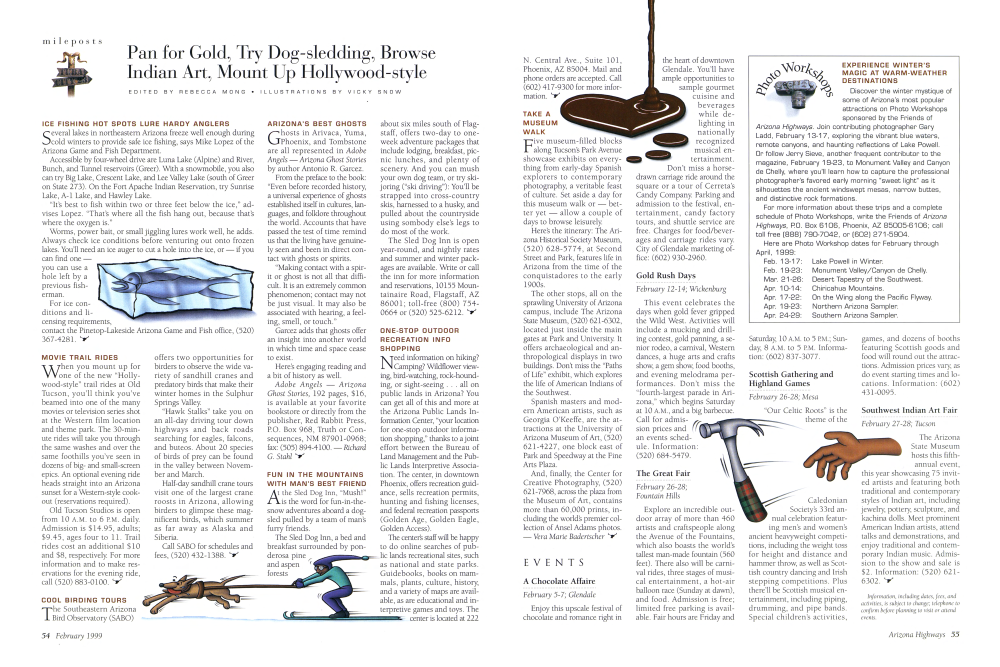 Discover the winter mystique of some of Arizona's most popular attractions on Photo Workshops sponsored by the Friends of Arizona Highways. Join contributing photographer Gary Ladd, February 13-17, exploring the vibrant blue waters, remote canyons, and haunting reflections of Lake Powell. Or follow Jerry Sieve, another frequent contributor to the magazine, February 19-23, to Monument Valley and Canyon de Chelly, where you'll learn how to capture the professional photographer's favored early morning "sweet light" as it silhouettes the ancient windswept mesas, narrow buttes, and distinctive rock formations.