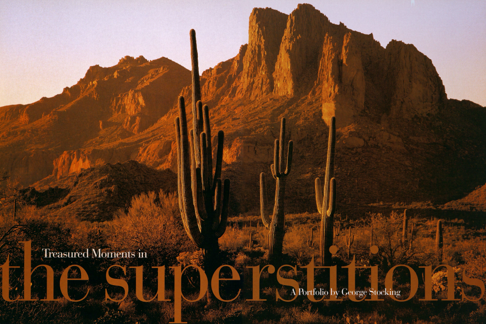 A CITY BOY FRESH FROM THE URBAN JUNGLES OF PHILADELPHIA, I WAS INSTANTLY drawn to the grandeur and mystery of the Superstition Mountains. I reveled in their brooding beauty, embellished by tales of Spanish conquistadores, marauding Indians, lost lives, and lost gold. The southern face of the range near Peralta Canyon became my special refuge, as I wandered its vast fields of chainfruit cholla and the saguaro forests on the upper bajadas. Summer brings the monsoons here, the great storms with their billowing clouds and magical rainbows. But the moments I treasure most in the Superstitions come in winter. As the sun moves farther south, into my favored realm, the light softens imperceptibly day by day, enveloping the cactuses, the washes, and the faces of the towering cliffs in a rosy glow. Ephemeral in reality, perhaps, but everlasting in memory.(PRECEDING PANEL, PAGES 28 AND 29) Mountains of mystery and myth, lost gold and broken dreams, the Superstitions inspired legends surpassed only by the range's rugged beauty.