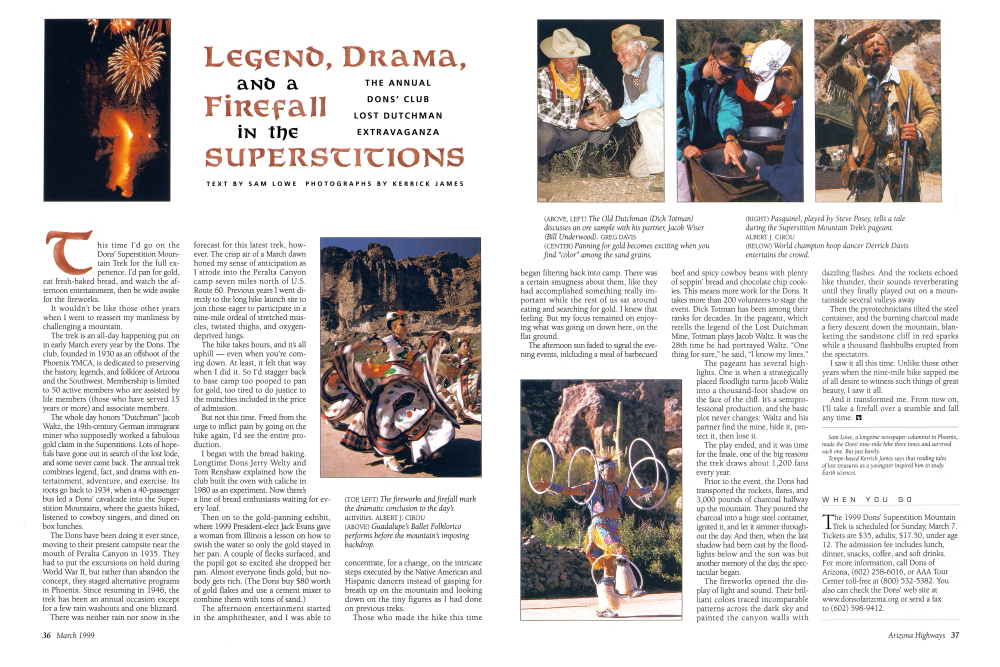 The 1999 Dons' Superstition Mountain Trek is scheduled for Sunday, March 7. Tickets are $35, adults; $17.50, under age 12. The admission fee includes lunch, dinner, snacks, coffee, and soft drinks. For more information, call Dons of Arizona, (602) 258-6016, or AAA Tour Center toll-free at (800) 532-5382. You also can check the Dons' web site at www.donsofarizona.org or send a fax to (602) 598-9412.