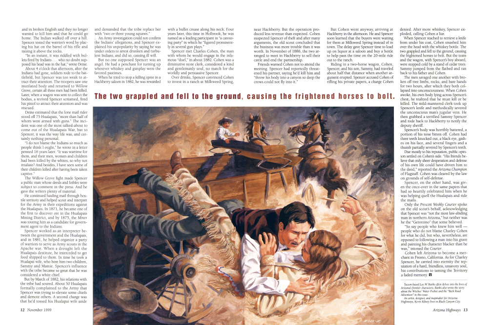 Riding in a two-horse wagon, Cohen, Spencer, and his son, Sammy, had traveled about half that distance when another argument erupted. Spencer accused Cohen of rifling his private papers, a charge Cohen denied. After more whiskey, Spencer exploded, calling Cohen a liar. When Spencer reached to retrieve a knife from under his coat, Cohen smashed him over the head with the whiskey bottle. The two grappled and fell to the ground, causing the frightened horses to bolt. But the team and the wagon, with Spencer's boy aboard, were stopped cold by a stand of cedar trees. Sammy jumped from the flatbed and ran back to his father and Cohen. The men savaged one another with broken off tree limbs, rocks, and bare hands for two hours, after which they both collapsed into unconsciousness. When Cohen awoke, his own body lying across Spencer's chest, he realized that he must kill or be killed. The mild-mannered clerk took up Spencer's knife and methodically severed the unconscious man's jugular vein. He then grabbed a terrified Sammy Spencer and rode back to Hackberry to notify the deputy sheriff. Spencer's body was horribly battered, a portion of his nose bitten off. Cohen had three teeth knocked out, a black eye, gashes on his face, and several fingers and a thumb partially severed by Spencer's teeth. Due mostly to his reputation, public opinion settled on Cohen's side. "His friends believe that only sheer desperation and defense of his own life could have driven him to the deed," reported the Arizona Champion of Flagstaff. Cohen was cleared by the law on grounds of self-defense. Spencer, on the other hand, was given the once-over in the same papers that had so heartily celebrated him when he was helping quell the Hualapais and ride the mails.